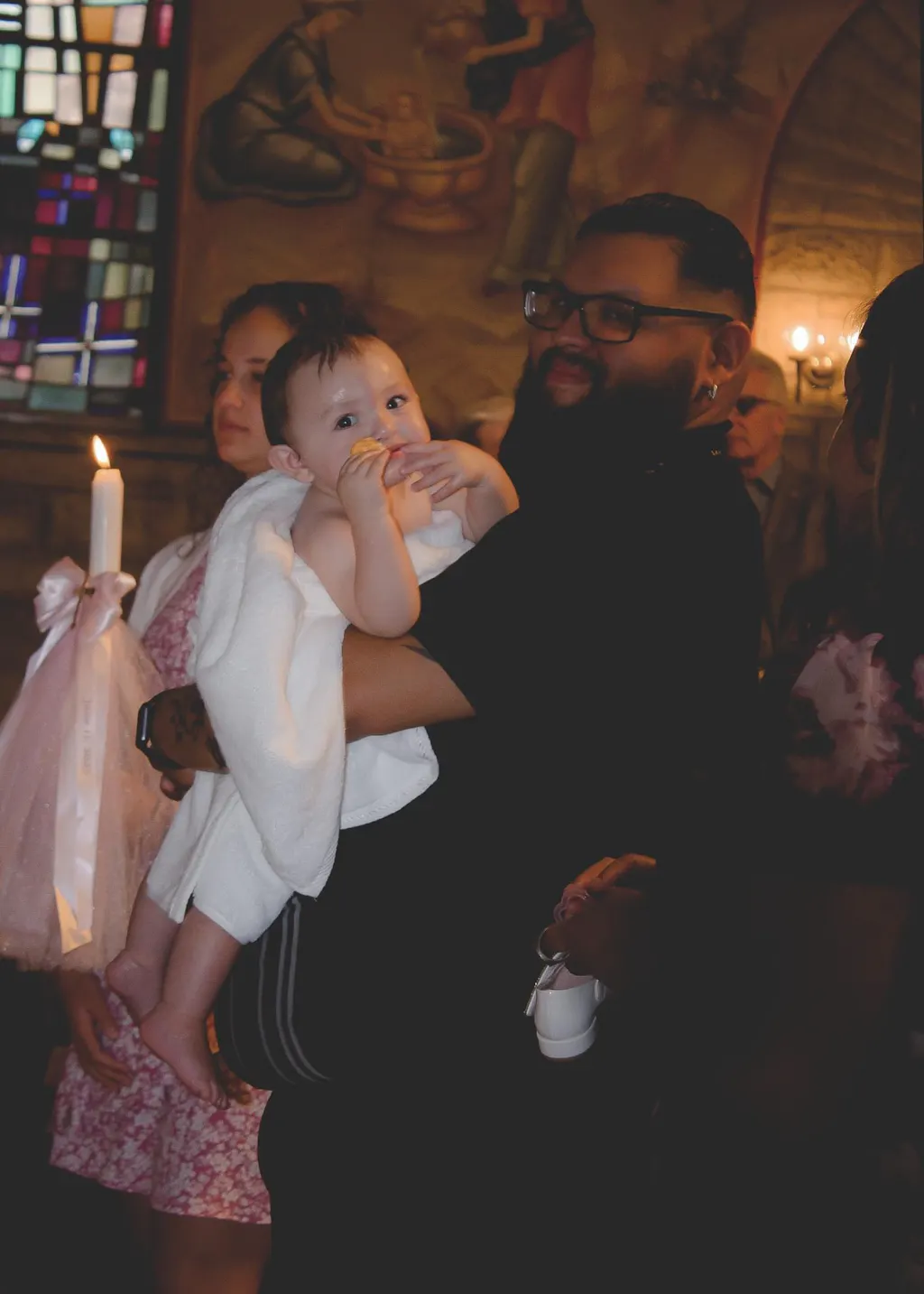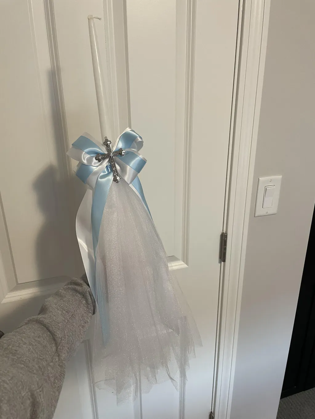 Our most popular Matthew design. Our traditional two-tier bow with streamer ribbon with tulle layers around the candle stem. A cross adorns the center.