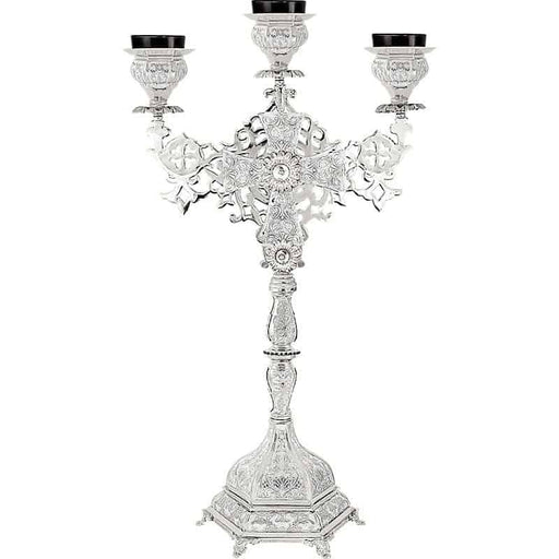 No reviews$1,400.00This ornate silver-plated Trikantili Lychnia is a three-candle ecclesiastical lamp designed for Orthodox altars and sanctuaries. Featuring a centra...