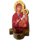 The icon is set against a uniquely contoured wooden backdrop, bringing warmth and dimension to the sacred image. At the base, a recessed holder securely accommodates a red glass votive candle, inviting moments of prayer, reflection, and serenity.