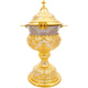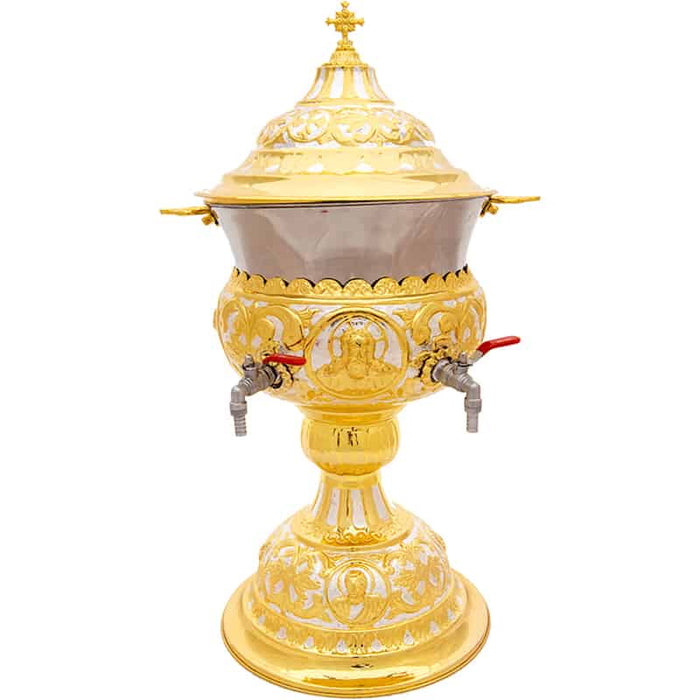 An ornate and visually stunning piece, this bicolor holy water font combines rich gold and polished silver tones to create a sacred vessel worthy of any ceremonial space. The detailed engravings depict holy figures and decorative motifs, while the domed lid is crowned with a golden cross. Two side handles and dual spouts add functionality to its reverent design.
