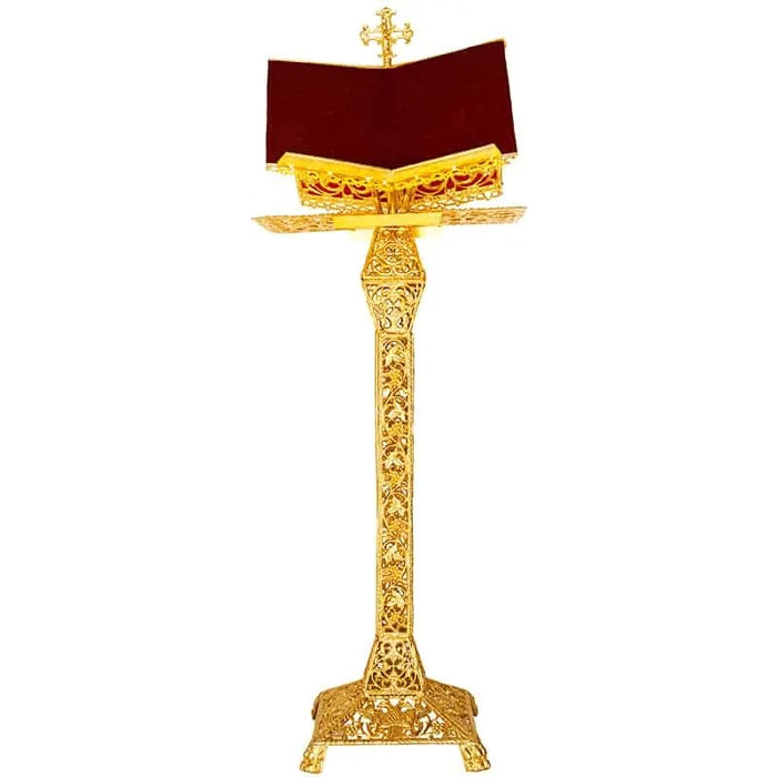 Commonly known as an "Analogion" in Eastern Orthodox and Eastern Catholic liturgical traditions, this Holy Book stand is refined with a gold-toned finish, showcasing elaborate filigree work and a decorative cross at the top—designed specifically to hold sacred texts or Gospel books during religious services.