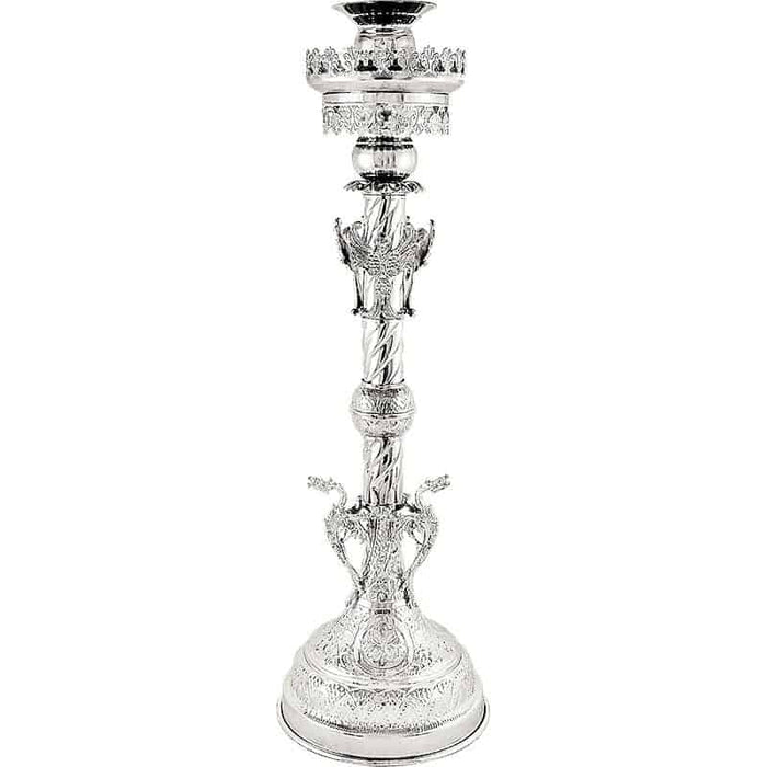 This stunning silver-plated bronze candlestick features a detailed unicorn carving in the traditional Orthodox style. Handcrafted in Greece, it showcases exceptional artistry with ornate embossing, a spiral column, and regal accents. The unicorn, a rare symbol in ecclesiastical design, evokes purity and divine protection.