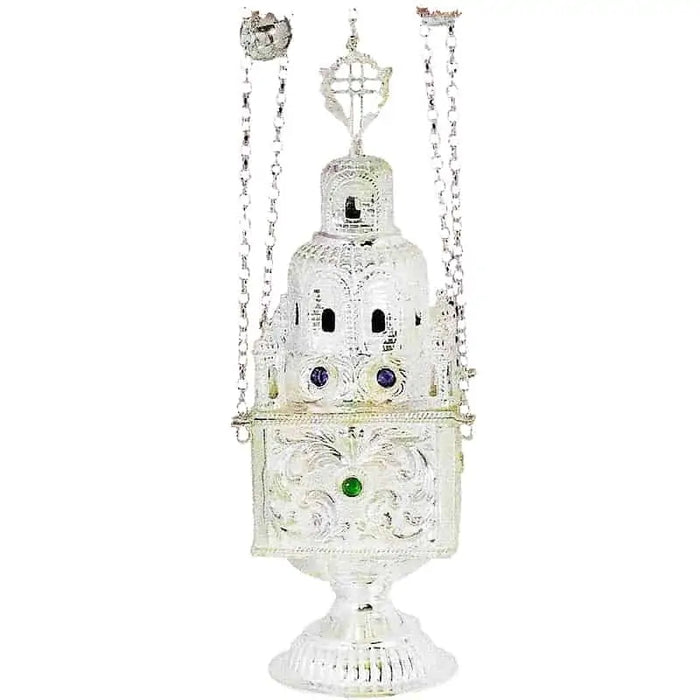 This beautifully crafted handmade silver censer is a sacred and essential vessel used in every Orthodox Divine Liturgy. Designed with intricate detailing and adorned with gemstone-style accents, this censer reflects the timeless elegance and spiritual symbolism of Orthodox worship.
