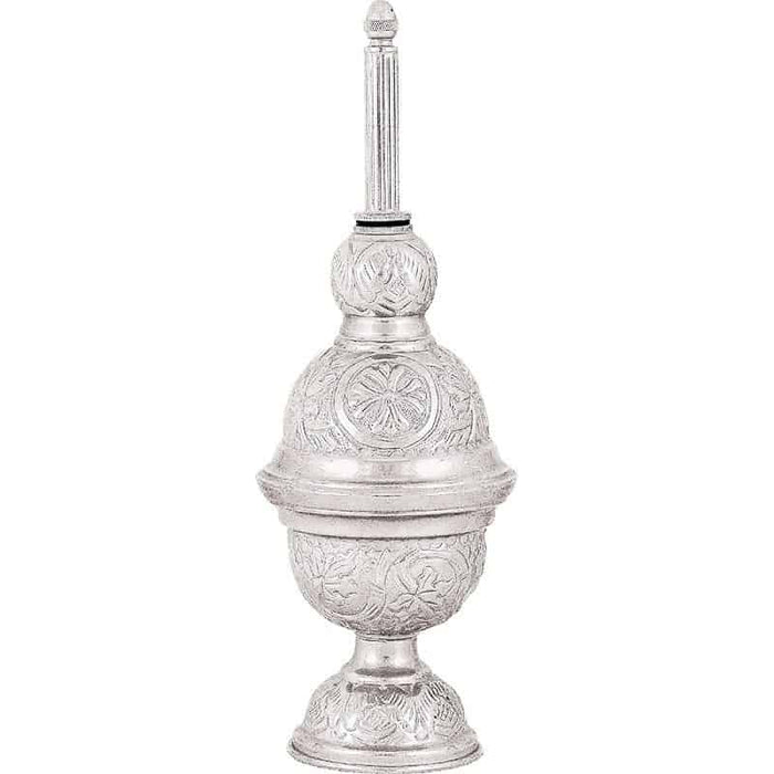 This beautifully crafted Holy Water Sprinkler (Ραντιστήρι) is an elegant ecclesiastical vessel used in Orthodox Christian worship for the blessing of people, icons, and sacred spaces. Featuring a full silver finish with detailed engraved floral patterns and a striking black enamel cross, this piece blends tradition, symbolism, and reverence.