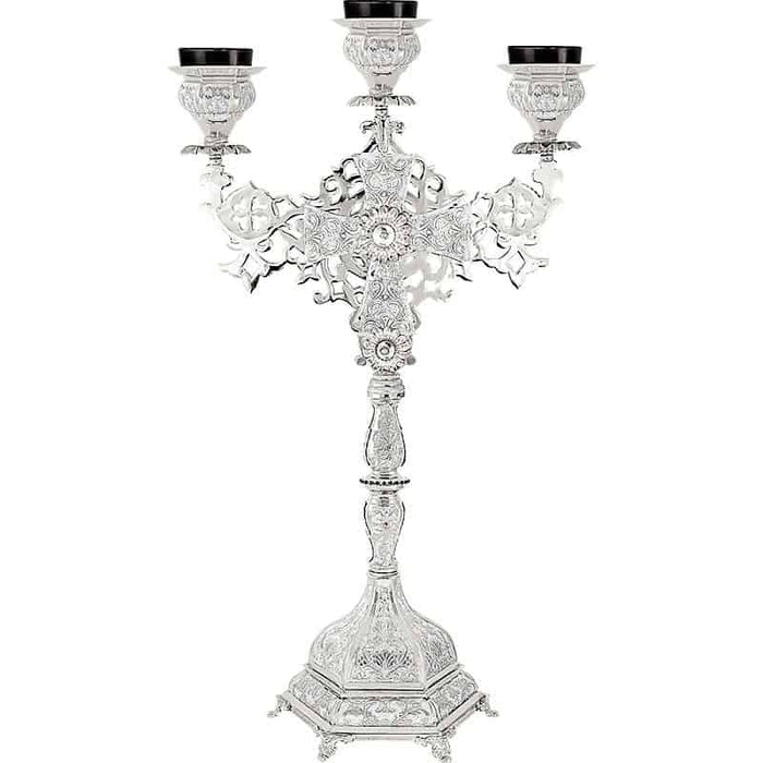 This ornate silver-plated Trikantili Lychnia is a three-candle ecclesiastical lamp designed for Orthodox altars and sanctuaries. Featuring a central engraved cross and beautifully crafted candle holders, this piece radiates liturgical elegance and sacred symbolism.