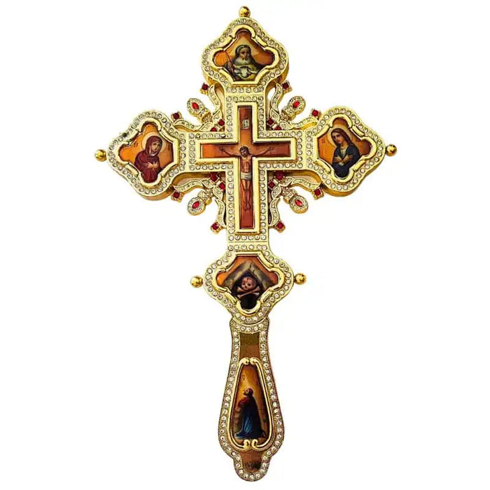 This Blessing Cross is made of gold-plated bronze, measuring 30 x 19.5 cm (approximately 11.8 x 7.7 inches), and is adorned with brilliant rhinestones, enamel inlays, and iconographic depictions of saints. It beautifully captures the elegance and solemnity of the Orthodox tradition.