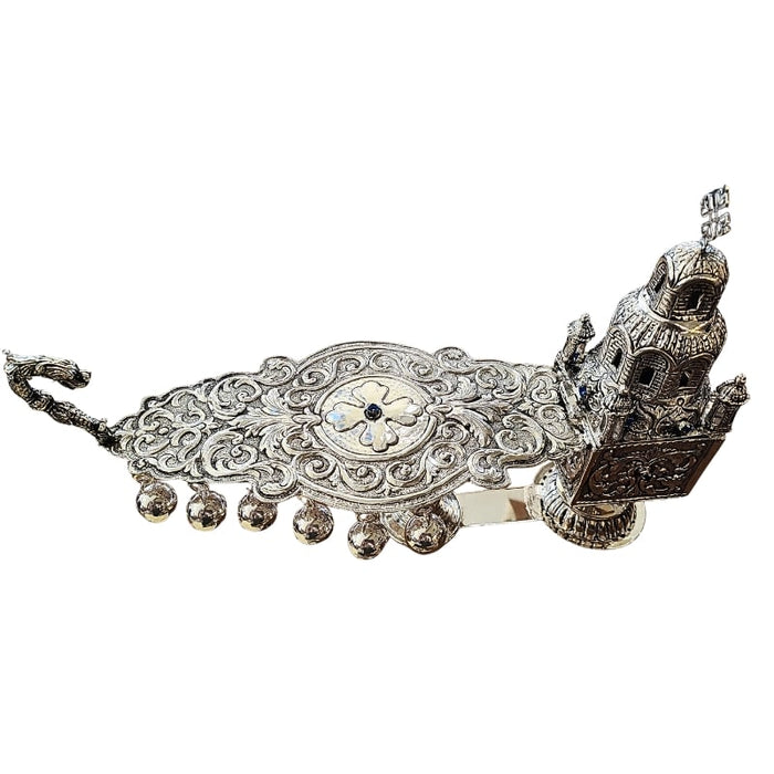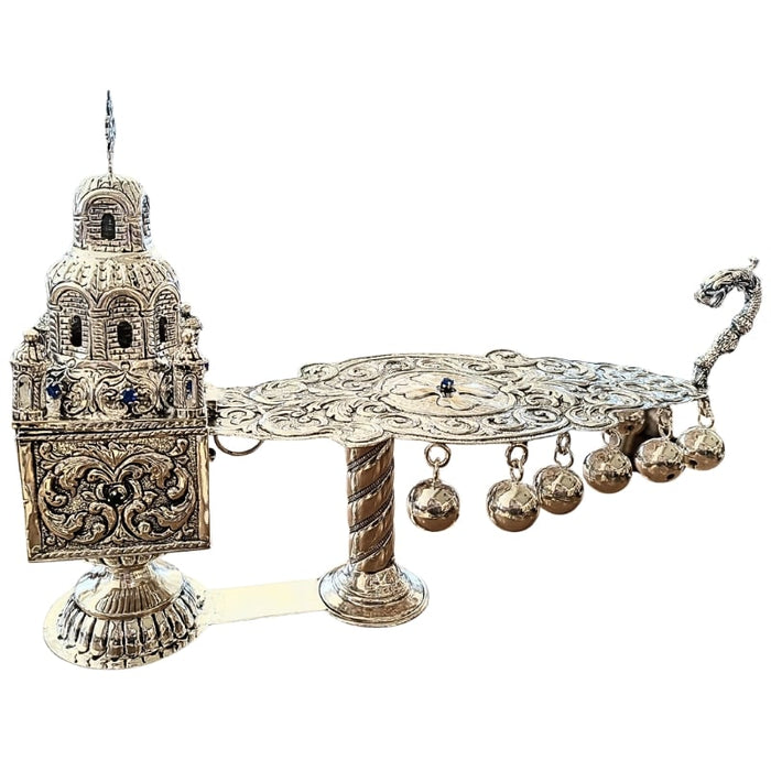 This exceptional handmade silver-plated censer is a true work of ecclesiastical art, inspired by Byzantine architecture and symbolism. Carefully crafted to resemble an orthodox chruch dome, it features detailed arches, miniature windows, and is embellished with blue stone accents and floral engravings.