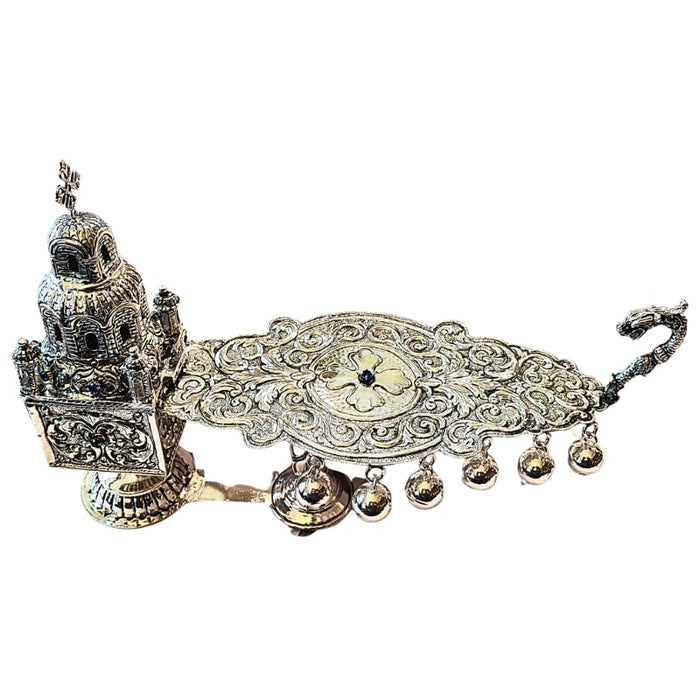 Design: Byzantine-style temple with detailed carving, bells, and dragon handle