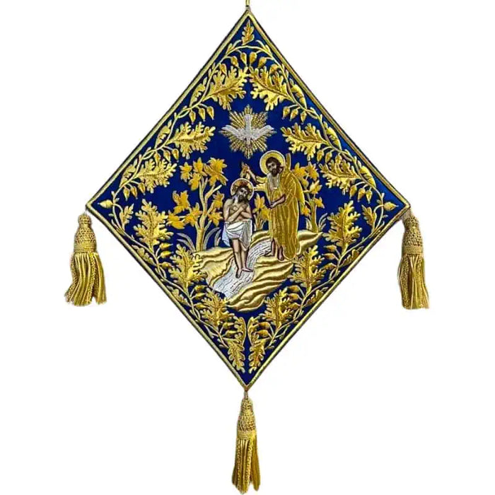 • Handmade gold-thread embroidery featuring the Baptism of Christ