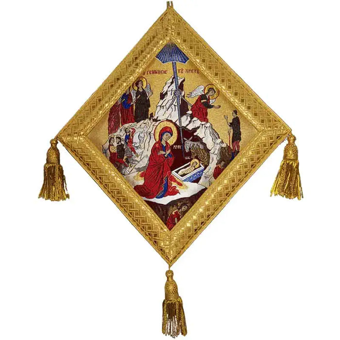 Celebrate the divine mystery of the Incarnation with this exquisite handmade Epigonation, featuring a detailed gold-thread embroidery of the Birth of Jesus Christ. The sacred scene of the Nativity—depicting the newborn Christ, the Theotokos, and the Star of Bethlehem—serves as a powerful symbol of light, hope, and salvation.