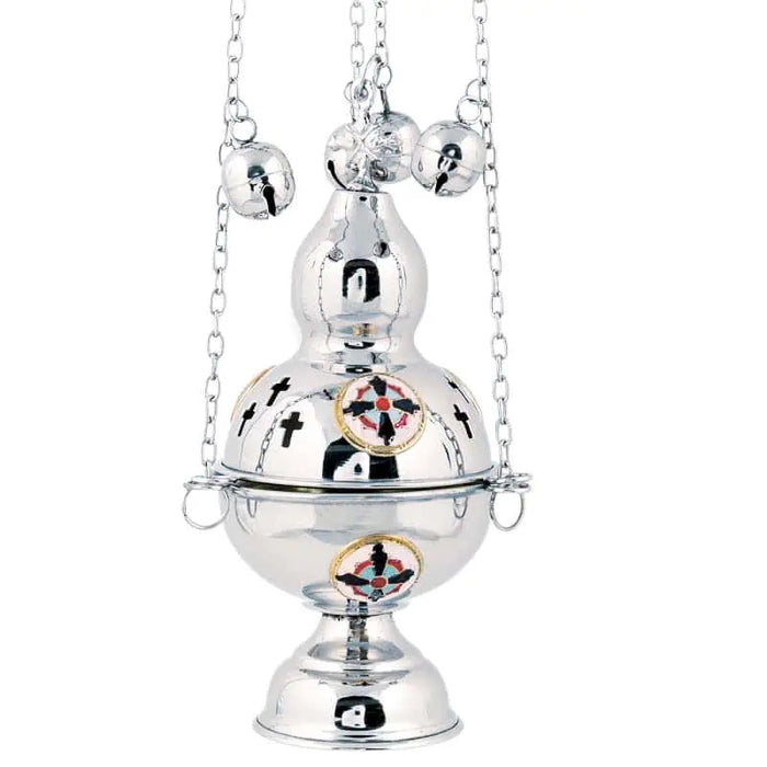 Silver-Plated Orthodox Censer – 12-Bell Suspension with Enamel Cross Detail