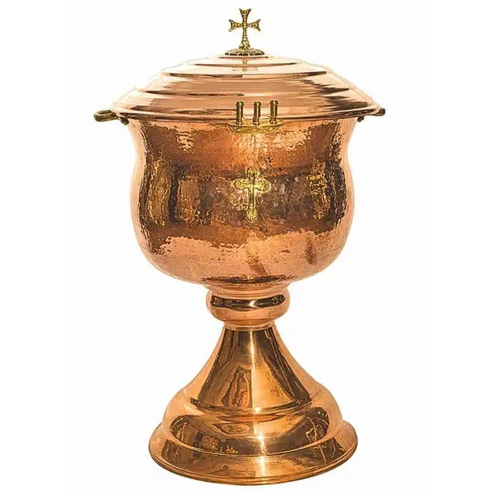 The Bronze Baptismal Font with Copper Lid is an exceptional ecclesiastical vessel designed for the sacred sacrament of baptism. Crafted entirely from pure copper, it features a hand-forged surface that gives each font a distinctive, artisanal texture and warm, luminous tone.