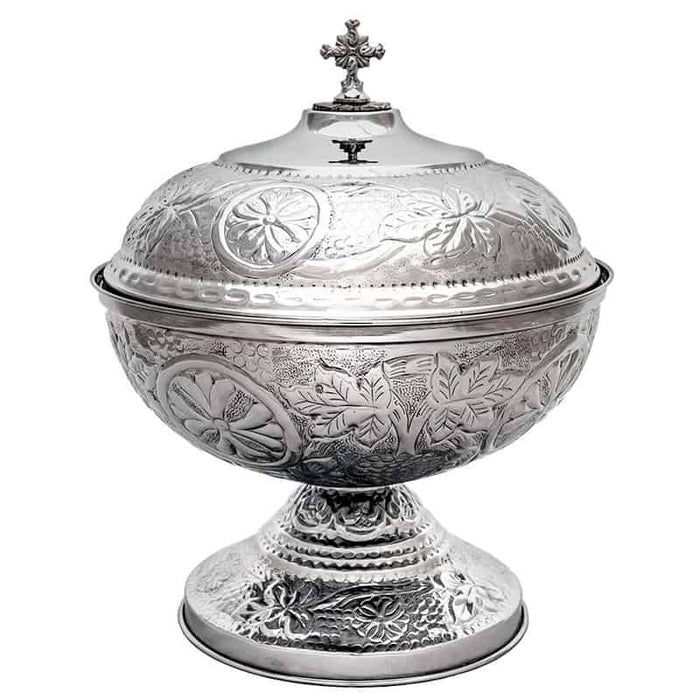 Crafted with reverence and artistry, this Greek Orthodox bread bowl serves as both a sacred vessel and a beautiful liturgical piece. Designed in a Chrome Carving finish, the bowl features hand-carved detailing that reflects traditional Orthodox symbolism and craftsmanship.